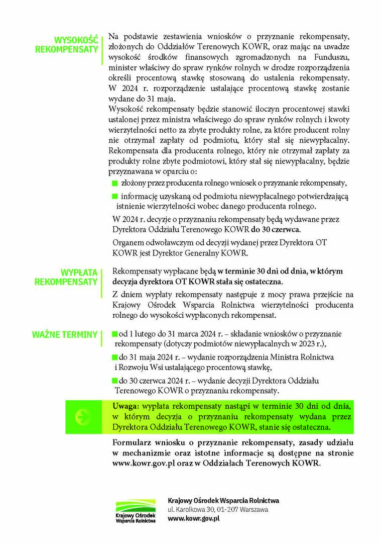 Z upoważnienia Dyrekcji Oddziału Terenowego Krajowego Ośrodka Wsparcia Rolnictwa w Lublinie uprzejmie informuję, że zgodnie z ustawą z dnia 9 maja 2023 r. o Funduszu Ochrony Rolnictwa, ze środków finansowych Funduszu będą przyznawane i wypłacane rekompensaty producentom rolnym, którzy nie otrzymali zapłaty za produkty rolne zbyte podmiotowi skupującemu, który stał się niewypłacalny w 2023 roku.