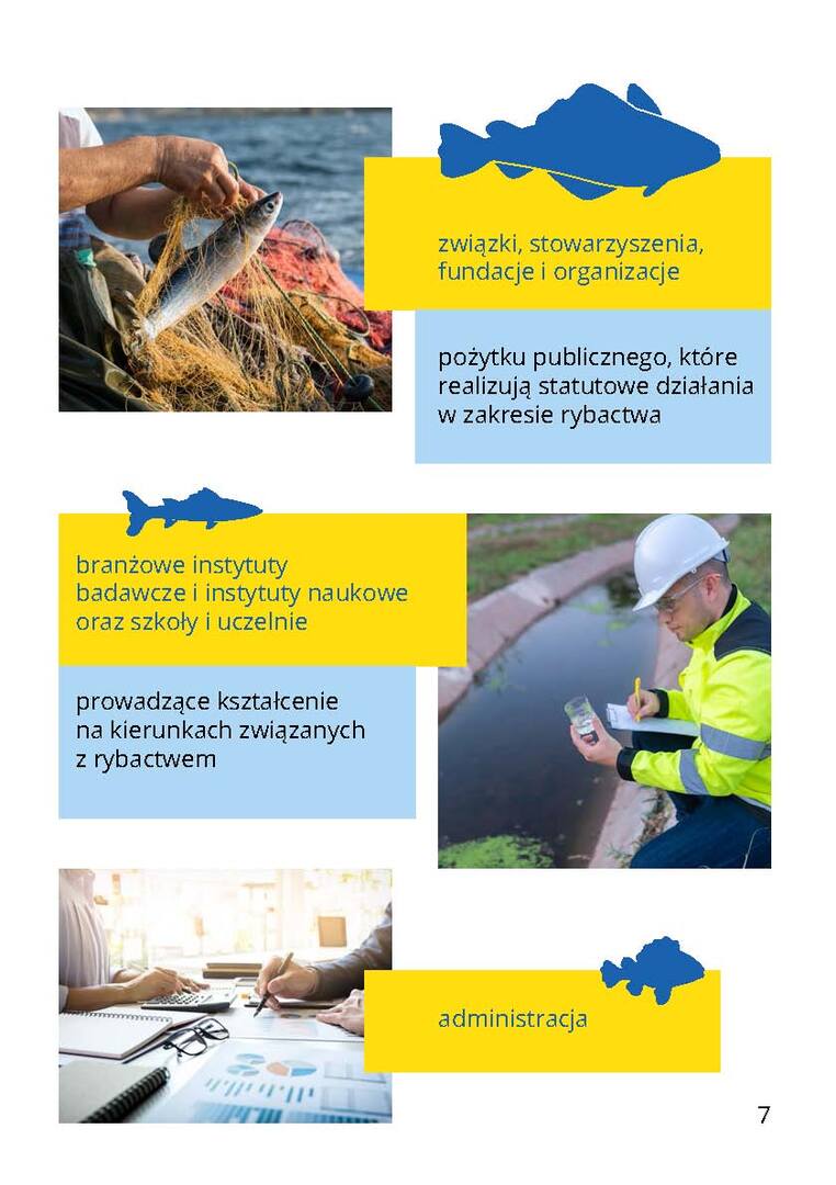 * organizacji rybackich, organizacji zrzeszających producentów akwakultury, organizacji producentów ryb, związków, stowarzyszeń fundacji i organizacji pożytku publicznego realizujących statutowe działania w zakresie rybactwa,