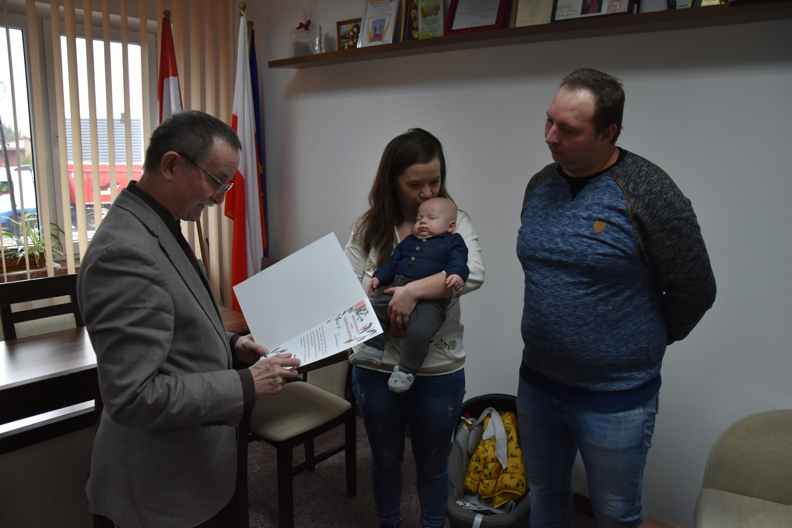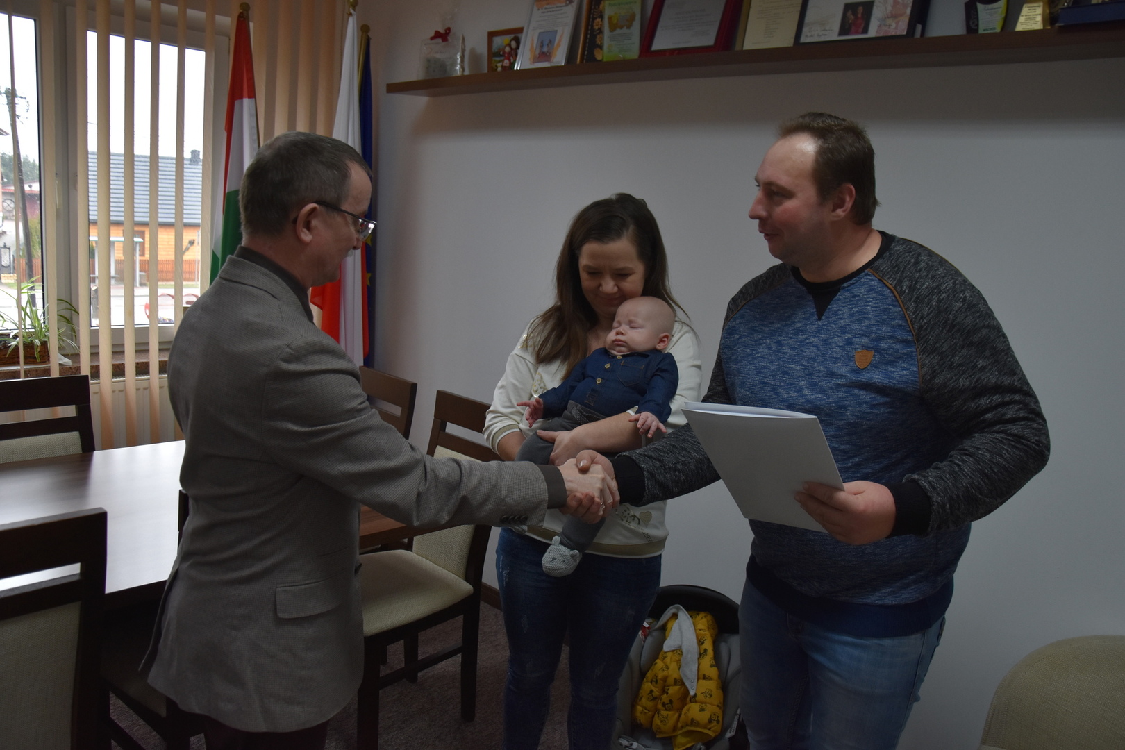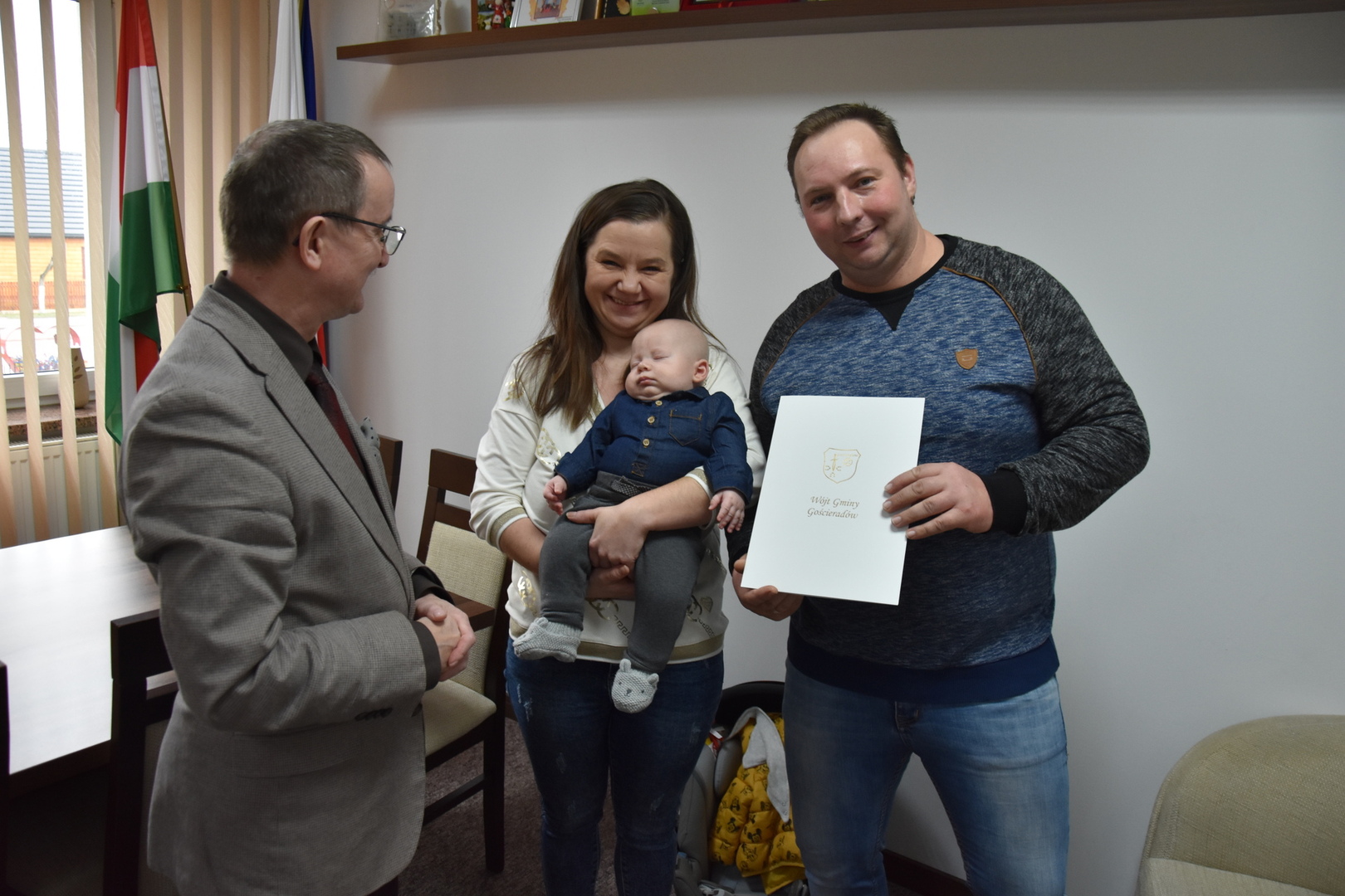 Podczas dzisiejszego spotkania (04.03.2024 r.) w Urzędzie Gminy Gościeradów, wójt Mariusz Szczepanik serdecznie gratulował świeżo upieczonym rodzicom Mariuszowi i Ewelinie Figurom z okazji narodzin syna Szymona oraz złożył życzenia dla całej rodziny.