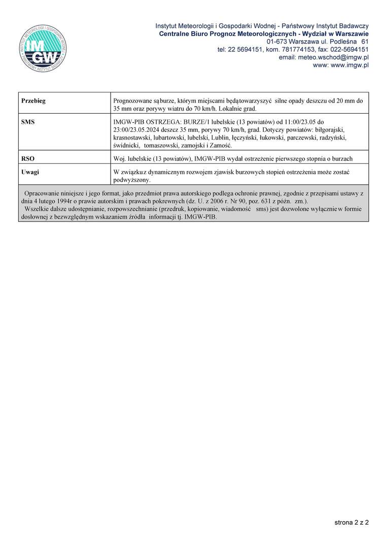 SMS IMGW-PIB OSTRZEGA: BURZE/2 lubelskie (5 powiatów) od 11:00/23.05 do 23:00/23.05.2024 deszcz 55 mm, porywy 70 km/h, grad. Dotyczy powiatów: janowski, kraśnicki, opolski, puławski i rycki.