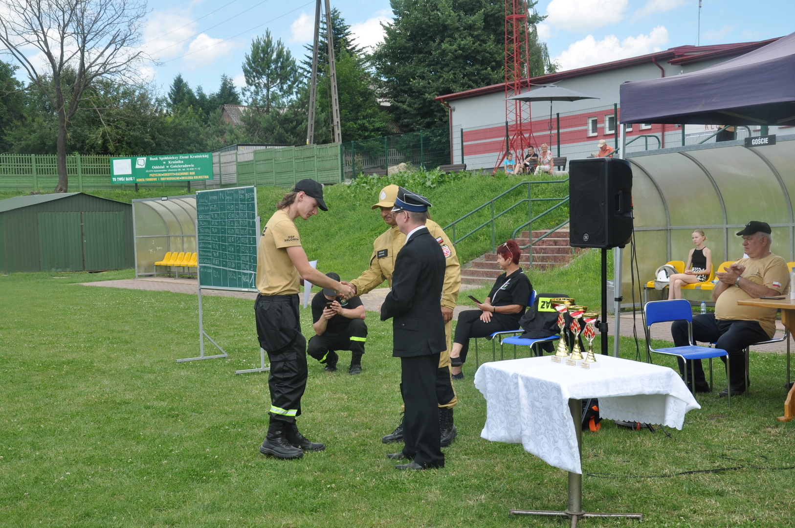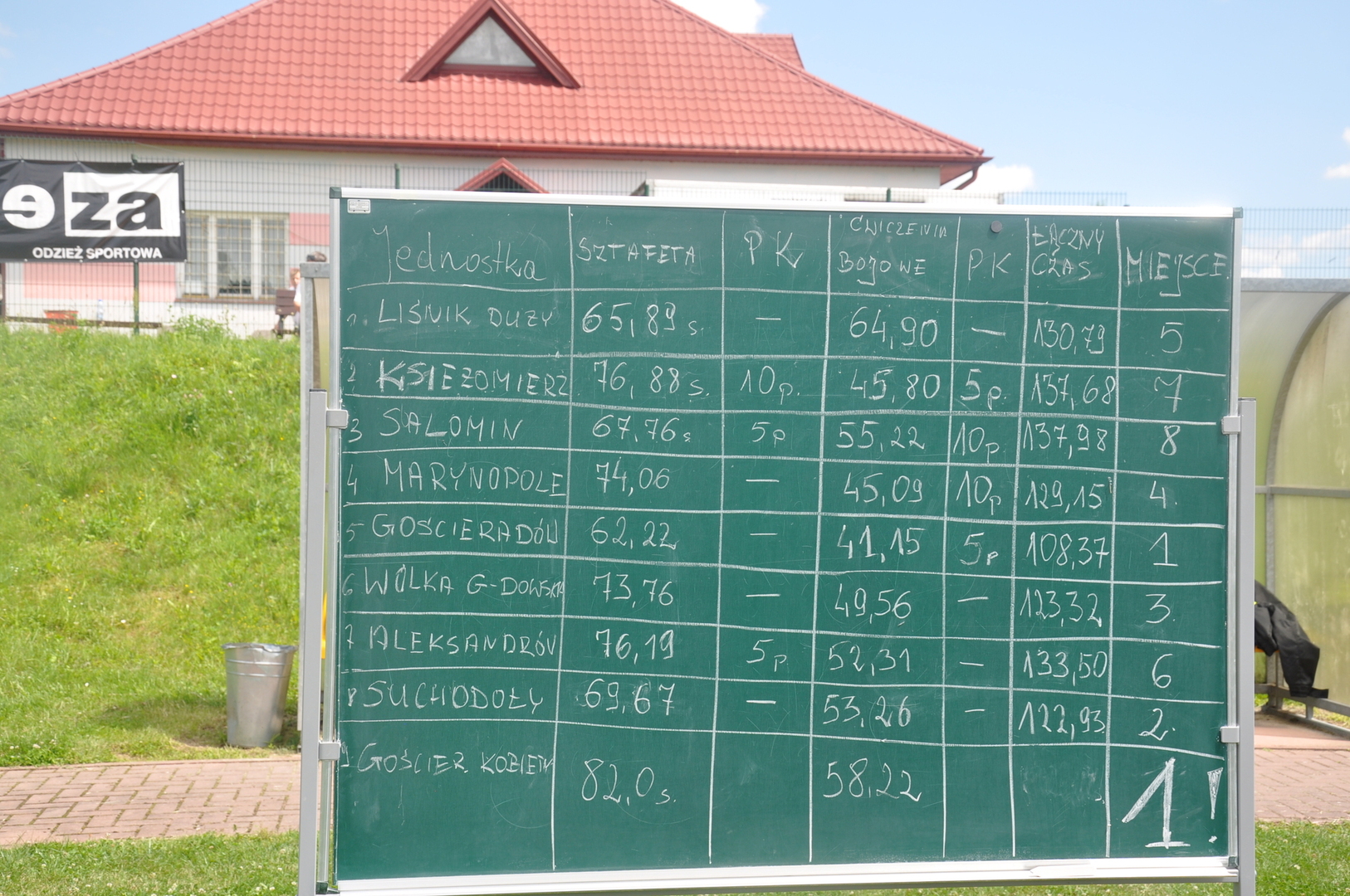 Zawody rozgrywane były w 2 konkurencjach: sztafecie pożarniczej 7 x 50 m z przeszkodami oraz ćwiczeniach bojowych. O wyniku końcowym decydował czas i poprawność wykonania zadań. W grupie kobiet I miejsce zajęły druhny z OSP Gościeradów. W grupie mężczyzn najlepsza okazała się także drużyna z Gościeradowa.
